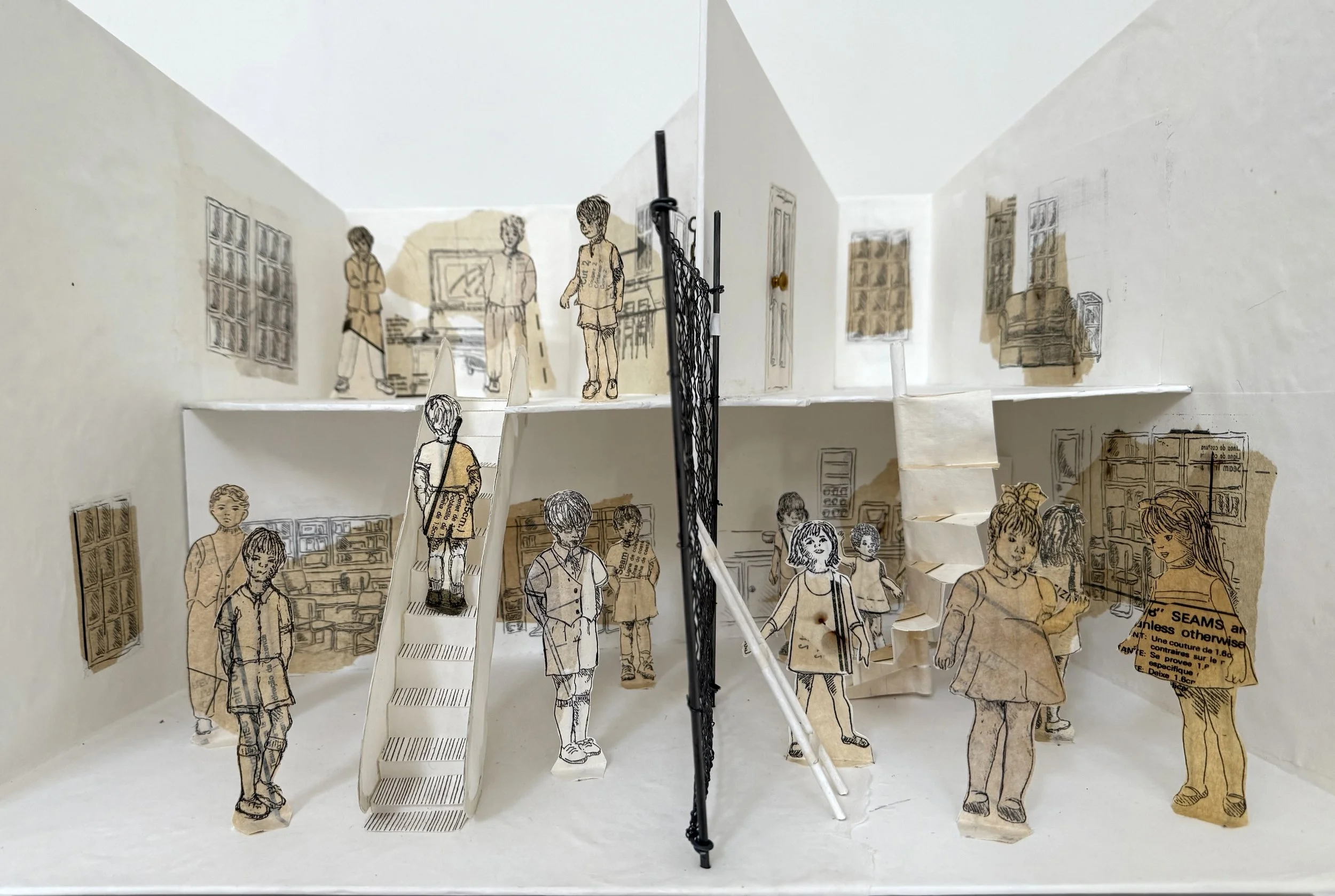 For more than a decade, Cooper’s work has centered on children’s safety and vulnerability, whether inside the home, in the classroom, or at the hands of governments and social systems. Using handmade Abaca paper, copy transfer prints, and found objects, she constructs floor-standing and suspended paper houses, diminutive furniture, and room-sized installations that evoke both innocence and threat.